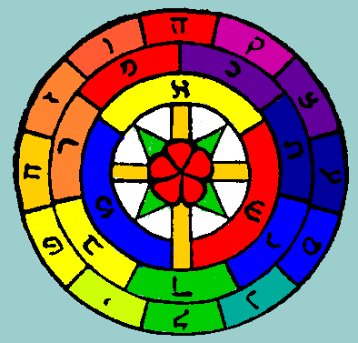 These all can be seen quite clearly if the symbols are overlaid on a colour wheel showing Primary, Secondary and Tertiary colours. Hebrew letters on a colour wheel specific to the Golden Dawn, as shown at the top of the page, show the Mother letters and elemental attributions associated with the Primary colours: Yellow for Air (Aleph), Blue for Water (Mem) and Red for Fire (Shin).