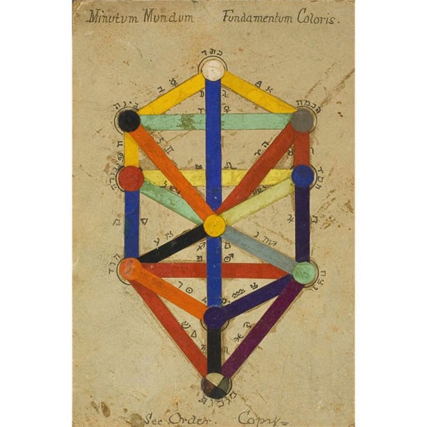 In terms of the uses of colour, the dedication required can be seen in the structure of the first five grades, each of which had to be completed before onto the next. These five grades were primarily theoretical and for what they called The Outer Order. Entry into the Inner Order (called the “Order of the Rose of Ruby and the Cross of Gold”) required an invitation to partake in the 5=6 ritual to achieve the Adeptus Minor grade. It was only near the end of that ritual, following deep questions, tests, trials and serious vows of secrecy, that the candidate was shown the Minitum Mundum sive Fundamentum Colouris (the Small Universe or Foundation of Colour), i.e., the diagram of the Tree with the Sephiroth coloured in Briatic, “feminine, passive” Queen Scale and the Paths in the “masculine, active King Scale “It thus represents the forces of Atziluth in the Paths uniting the Sephiroth as reflected in the Briatic World.” “See that thou reveal it not to the profane,” candidates were told, “for many and great are its mysteries.” (Please see Resources at the bottom of this page for links to more detailed information on the history and rituals of the Golden Dawn).