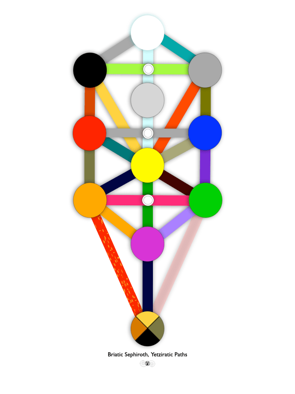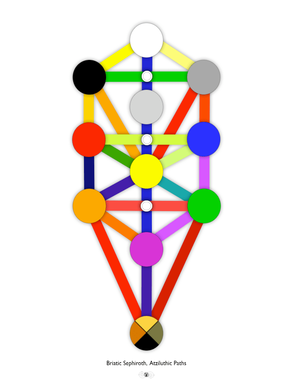 “The beams of Chesed and Tiphareth meet in Netzach and yield Green. The beams of Geburah and Tiphareth meet in Hod and yield a tawny Orange. The beams of Chesed and Geburah fall in Yesod and yield Purple. And thus is the Third Triad completed.